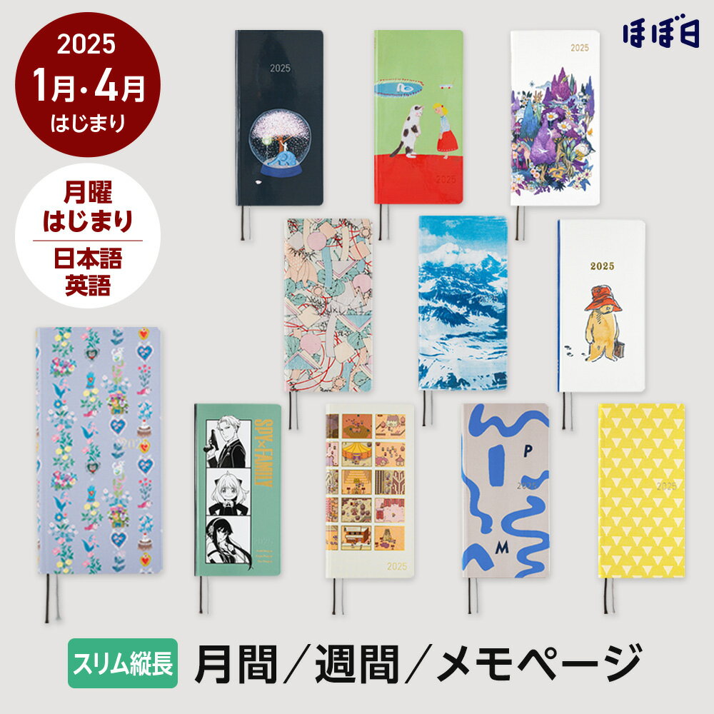 こちらは2025年はじまりの商品です。2026年はじまりの商品ではありません。 2025年はじまりの手帳はこちら 「使ったことないけど、ためしたい」かたはもちろん、 「使っているけど、家族や友人にもおすすめしたい」というかたに、 ぜひほぼ日手帳をおためしいただけたらと、 一部商品を約60%OFFの特別価格にて販売します。 つかってみてくださいね。 コンパクトなスリム縦長サイズで、 週単位の予定やTO DOの管理に。週間レフトタイプ weeks 携帯性を重視した、週間タイプのほぼ日手帳です。長財布と同等の大きさで、厚みは抑えたスリム縦長サイズ。鞄やスーツのポケットにもらくらく入ります。 基本ページは「週間予定+メモ」。左ページに1週間の予定、右ページにその週のメモを書くことができる「週間レフトタイプ」です。 ほぼ日手帳ならではの「日々の言葉」も、1週間に1つ掲載。コンパクトながらメモページが充実しているのも特長で、巻末には方眼ノートをたっぷり収録。 カバーをつけずに使えるタイプで、さまざまなデザインからお好みの表紙を選べます。 英語版(weeks・weeks MEGA) 日本語版のweeksを受け継いだデザイン。日付や曜日の表記はもちろん、「日々の言葉」や巻末のおまけページまですべてのページが英語で表記されています。 ※英語版のweeks・weeks MEGAは1月はじまりのみです。 ◆北岸由美/すてきな壁紙 北岸さんが手がけたドールハウスの壁紙のデザインをアレンジして使いました。メルヘンなモチーフがストライプ柄のように縦に整列しています。 硬めで軽くしなる程度のハードカバー仕様です。 ◆久保田寛子/夜桜スノードーム 満開の桜が美しい夜の公園をスノードームの中に閉じ込めたイラスト。ぞうのすべり台の上に立ったねこが花びらをつかんだ瞬間をイラストに。きらきらと舞う桜の花びらをピンクの箔で表現しています。 硬めで軽くしなる程度のハードカバー仕様です。 表紙の特性上、クリアカバーのご使用はおすすめしません。 ◆柴田ケイコ/ご苦労様です、青木さん 柴田ケイコさんの描く、お辞儀をするねこの青木さん。親密さがうかがえます。オイルパステルで描かれた温かみのある絵の雰囲気が長続きするように、表面にはつやつやしたPP加工をほどこしました。 硬めで軽くしなる程度のハードカバー仕様です。 表紙の特性上、クリアカバーのご使用はおすすめしません。 (c) Keiko Shibata ◆草野マサムネ×junaida/紫の夜を越えて 歌画本『ひみつストレンジャー』の中の「紫の夜を越えて」をデザイン。歌画本『ひみつストレンジャー』は、スピッツのアルバム『ひみつスタジオ』に収録されている草野マサムネさんが書いた13の楽曲の歌詞をもとに、junaidaさんが1曲にひとつずつ絵物語を描いた本です。 (c)Kusano Masamune, junaida ◆石川直樹/DENALI IN THE MIDNIGHT SUN #1 石川直樹さんによる、北米最高峰の山、デナリの写真作品をカバーに。「サイアノタイプ(青写真)」という、太陽光に露光する方法で現像されたもの。現像液を塗ったハケ跡が残っているのもこの作品の魅力です。 硬めで軽くしなる程度のハードカバー仕様です。 表紙の特性上、クリアカバーのご使用はおすすめしません。 ◆芸艸堂/美術海(七夕飾り) パステルカラーで描かれた幾何学的なモチーフ。実は昔の七夕飾りです。糸のような赤いラインが印象的。葉っぱや重なった紙など、さまざまなモチーフが見ていて飽きません。裏側は葉っぱにあわせたブルーグリーン。 硬めで軽くしなる程度のハードカバー仕様です。 ◆SPY×FAMILY/フォージャー家 TVアニメ「SPY×FAMILY」のキャラクターをモノトーンで縦に配置。スモーキーなグリーン地とモノトーンのイラストの組み合わせは落ち着いた雰囲気で大人の方にも持っていただけます。 硬めで軽くしなる程度のハードカバー仕様です。 表紙の特性上、クリアカバーのご使用はおすすめしません。 (c)遠藤達哉/集英社・SPY×FAMILY製作委員会 ◆パディントン(TM)/このくまをよろしく イギリスの児童小説から誕生したくまのパディントン(TM)とのコラボ。赤い帽子をかぶり、手にスーツケースをたずさえたパディントンを、うすいクリーム色の地にレイアウト。金色の箔で押した2025の数字がキラリと存在感を放ちます。 (c) P&Co. Ltd. 2024 ◆PAMM/thanks sea 砂浜のようなサンドカラーの地に、海をイメージした青い曲線を織りで表現。ちりばめられたPAMMのロゴはシックなネイビーで大人っぽくまとめています。「2025」の数字はシルバー箔でアクセントに。 硬めで軽くしなる程度のハードカバー仕様です。 ◆yuge fabric farm/うろこ紋 金襴の生地に、古来中国で好まれた「うろこ紋」が表現されています。上品な織りがひと目でわかり、鮮やかな黄色が美しいデザインです。 硬めで軽くしなる程度のハードカバー仕様です。 ◆MOTHER/SMILES & TEARS 『MOTHER2』のプレー中に撮った思い出の写真が全部で25枚並びます。ぼく(ネス)が旅立つ瞬間。はじめて訪れる土地の探索中。出会った仲間たちと——。思い出深い