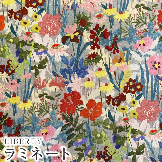 LIBERTYリバティプリント イタリア製つや消しラミネート(ビニールコーティング生地)<Wildflower Meadow>(ワイルドフラワーメドゥ)《グレー地/オレンジ系》MATLAMI3636422-D【2022SS FLORALOVE COLLECTION】