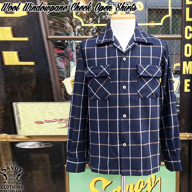 SAVOY CLOTHING Wool Windowpane Check Open Shirts サヴォイクロージング ウール ウィンドウペン チェック オープン シャツ 長袖 メンズ 50's 開襟 ロカビリー ファッション Rockabilly 衣装 サボイクロージング 原宿 ネイビー 紺 ピンク オールディーズ 50年代