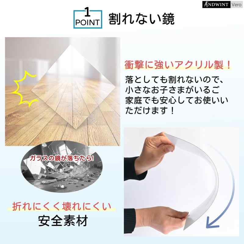 ANDWINT Vero 【どこでも貼れる割れない鏡】 壁掛け鏡 貼る鏡 4点セット DIY可能 アクリル製 インテリア ミラーシート 設置簡単 便利 軽量 全身鏡 姿見鏡【多用途設置】 玄関、浴室、クローゼット、リビングルームなど様々な場所に設置可能。コンパクトな28×28cmサイズで、スペースを効率よく利用できます。賃貸住宅にも最適で、壁に穴を開けずに簡単に設置できます。【簡単設置とお手入れ】 工具不要で、両面テープを使って簡単に約10分で設置できます。設置後、保護シールを剥がすことで清潔な状態が保たれ、日常のお手入れも簡単。指紋や汚れの付着を防ぎ、いつでも清潔に使用できます。【安全性と耐久性】 アクリル製で軽量、割れにくいため、万が一落下しても飛散せず安全です。子どもやペットのいる家庭でも安心して使用でき、災害時にも役立つ耐衝撃性を備えています。【視覚的効果とDIY】 フレームレスなシンプルデザインで部屋を広く見せ、インテリアとしても優れた効果を発揮。鏡を組み合わせて全身鏡として使うだけでなく、自由にカットして個性的なデコレーションにも最適です。【高品質アクリル素材】 厚さ2mmのアクリル素材を使用し、軽量でありながら堅牢。歪みを抑えた技術で、クリアな映像を提供します。日常的な身だしなみチェックに加え、スポーツ施設や教育施設でも高い実用性を発揮します。
