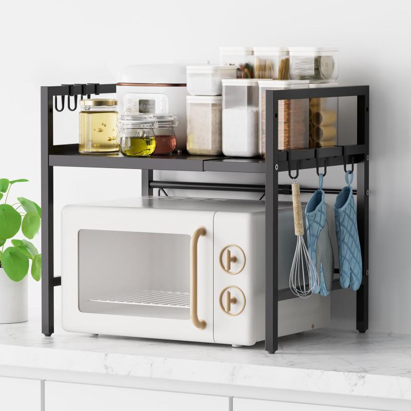 ANDWINT Vero レンジラック 伸縮式 幅42~62cm 高さ2段階調節 トースターラック キッチンラック レンジ台 調味料棚 フック6枚付属 省スペース 耐荷重30kg ブラック