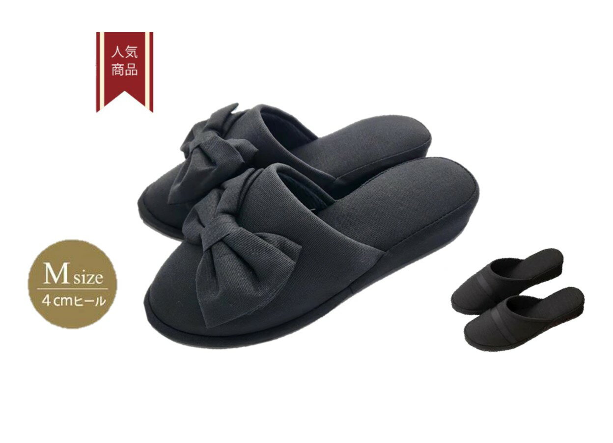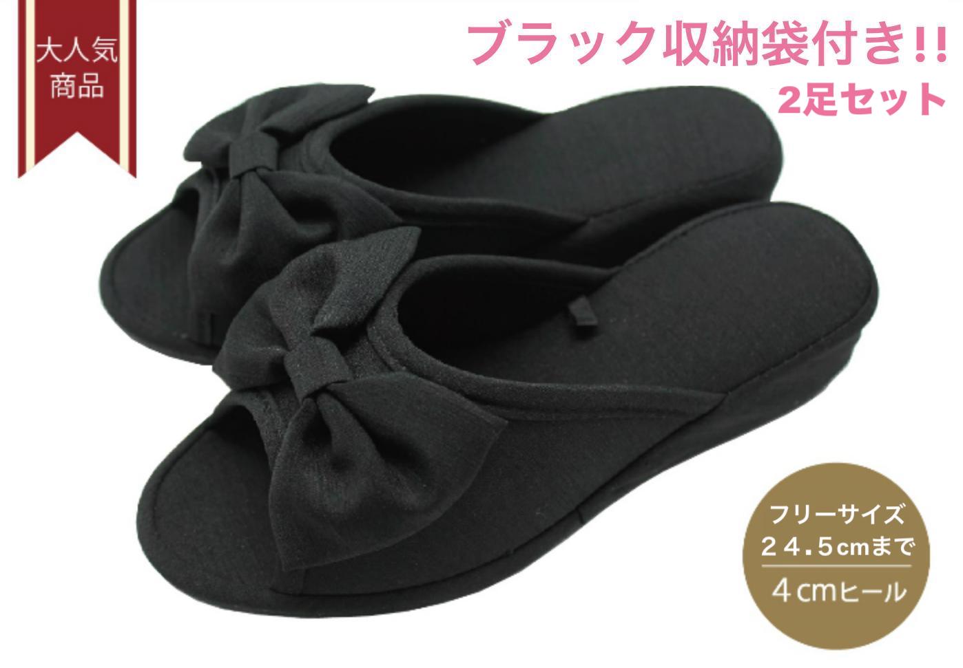 \20%OFF/シャンタン素材ヒール スリッパ 収納袋付き リボン ヒール スリッパセット 選べるサイズ 黒 ルームシューズ ヒール【ヒールスリッパ】【ルームシューズ ヒール】