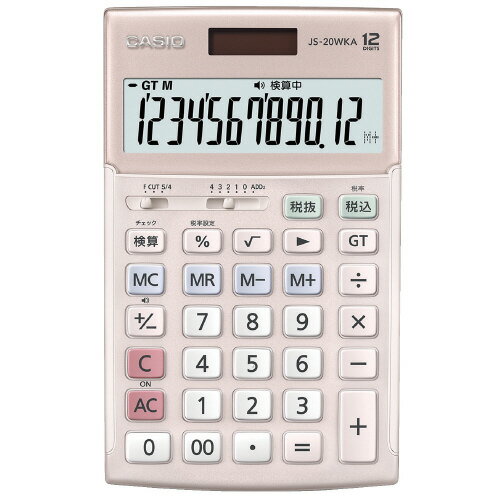 ●検算機能付の本格実務電卓、ジャストサイズ、カラーはピンクです。●バッテリー残量表示、早打ち対応!(3キーロールオーバー)●2色成型プラスチックキー。長期間の使用でも数字が消えない2色成型構造を採用。●大型ストッパー。操作時のすべりを抑え快適な計算を可能に。●桁数/12桁●寸法/W107×D174.5×H24.2mm●質量/約210g●色/ピンク●メモリー/2●機能/計算状態表示、2色成型プラスチックキー、サイレントタッチキー、検算機能付、早打ち対応、税計算、バッテリー残量表示●表示部/傾斜●保証期間/5年※質量は電池含む●メーカー/カシオ●型番/JS-20WKA-PK-N●JANコード/4549526613289※メーカー都合によりパッケージ・仕様等が予告なく変更される場合がございます。ご了承ください。本商品は自社サイトでも販売しているため、ご注文のタイミングにより、発送までにお時間をいただいたり、やむをえずキャンセルさせていただく場合がございます。※沖縄へのお届けは別途1650円(税込)の送料がかかります。