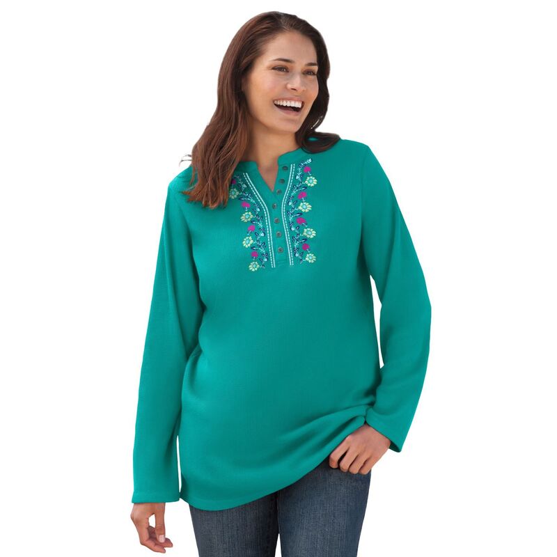 ウーマン ウィズイン レディース トップス Tシャツ プラスサイズ 刺繍 Woman Within Women's Plusizembroidered Thermal Henley Tee Waterfall Vine