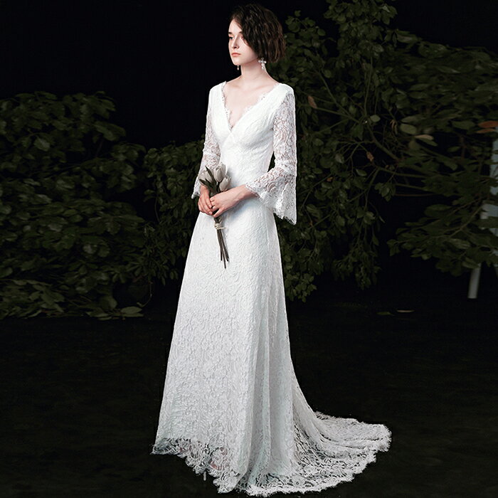 【P5倍★BLACK FRIDAY限定】ウェディングドレス ウエディングドレス ロングドレス 二次会 結婚式 前撮り ブライダル 花嫁 長袖 スレンダードレス ファスナー レース 海外挙式 披露宴 フォトウェディング オフホワイト wedding dress パーティードレス