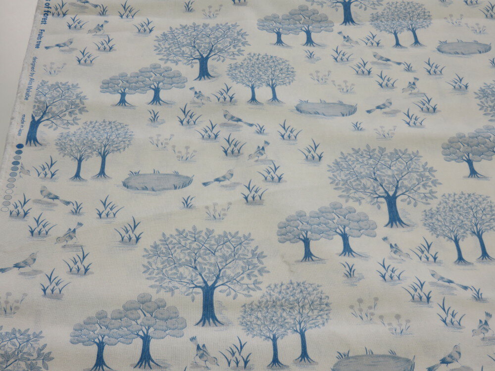 1m単位 アウトレット40% ハーフリネン マカベアリス words of forest Fruits tree オフ×ブルー キャンバス生地 dou【メール便2m可】 マークダウン メーカー処分品 生地 布地 布 綿麻 リネン 服地 洋裁