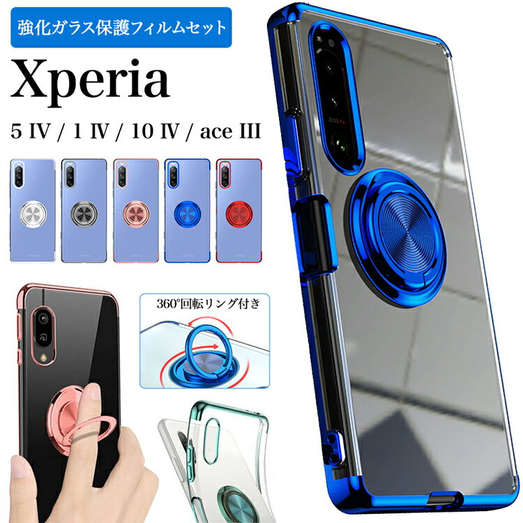 ガラスフィルムセット Xperia 5 IV 1IV 10 IV ace III ケース SOG09 SO-54C SOG06 SO-51C SOG07 SO-52C SOG08 SO-53C エクスペリア エースマーク3 カバー サイドメッキ ソフト メタリック TPU クリア 透明 シンプル おしゃれ 便利 360度回転バンカーリング付きスマホケース