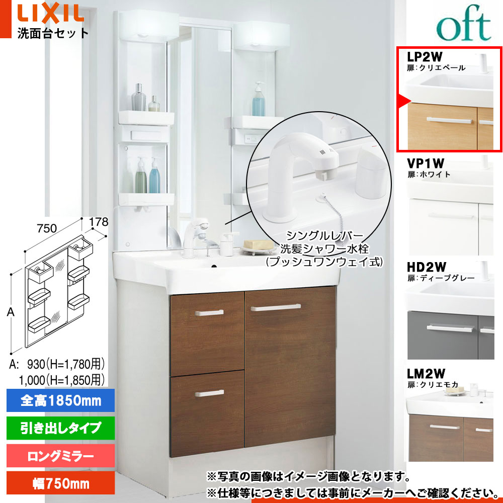★[FTV2H-755SY-W_LP2W+MFTX2-751XPJ] リクシル LIXIL INAX OFT オフト 洗面台 750mm 引出タイプ 洗面化粧台 シングルレバー洗髪シャワー水栓