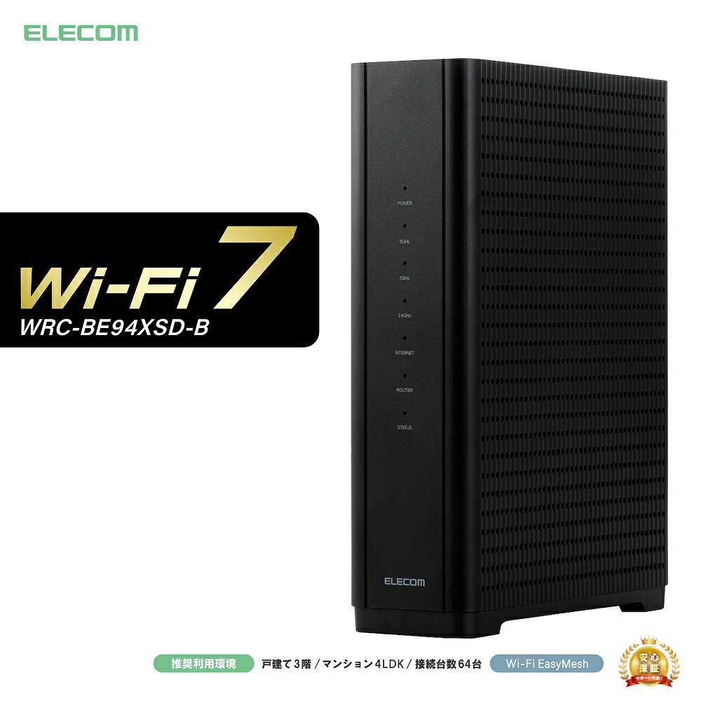 エレコム WRC-BE94XSD-B EasyMesh WiFi ルーター 親機 Wi-Fi 7 11be/11ax IPv6対応 Windows mac等対応 ブラック 発売日:2025年4月24日●Wi-Fi 7対応でさらに高速な通信を実現。動画視聴など、より高速な通信が要求されるコンテンツでも、スムーズなオンライン体験を提供。2.4GHz、5GHzはもとより、6GHzすべての帯域に対応することで、電波干渉による混雑を回避。通信エリアを広げるWi-Fi EasyMesh(TM)、家中まるごと安心のAIセキュリティ機能、F-Secure SENSE搭載。ご自宅のマルチギガ回線のメリットも活かせる、IPv6(IPoE)対応 Wi-Fi 10ギガビットルーターです。●Wi-Fi 7対応でさらなる高速、低遅延で快適な通信を実現します。●複数のバンドとチャンネルでデータの同時送受信を可能にしたMLOに対応し、より高速なデータ通信、大容量のファイルの高速ダウンロードが可能になりました。本製品のMLOは「2.4GHz+5GHz+6GHz」、「2.4GHz+5GHz」または「5GHz+6GHz」の選択式で、お使いの端末に合わせて最適なMLOを選択可能です。●無線通信で一度に利用できる帯域幅が、160MHz幅から320MHz幅に拡張されたことで、従来のWi-Fi 6製品と比べて2倍の通信速度を実現できます。●※320MHz幅の通信は、6GHz帯のみ利用可能です。●1ユーザーに複数のリソースユニットを組み合わせて割り当てることで、周波数利用効率が向上するマルチリソースユニット(Multi-RU)に対応し、より通信の安定性が向上しました。●電波干渉を避けて、より速く途切れない通信を可能にしたプリアンブル パンクチャリング(Preamble Puncturing)技術により、複数のデバイスを同時に使用する家庭やオフィスで、より接続性を改善することができます。●※各機能を端末で利用するためには本製品だけでなく、端末も各機能に対応している必要があります。●※Wi-Fi 7対応端末であってもすべてのWi-Fi 7機能に対応していない場合もあります。●Wi-Fi 7対応で混雑の少ない快適な通信を実現します。これまでの2.4GHz帯/5GHz帯に加え、6GHz帯の利用が可能となり、既存帯域の電波干渉による混雑から解放され、高速な通信が実現できます。 【仕様】対応OS(Windows):Windows 11/10対応OS(macOS):macOS Sequoia 15/macOS Sonoma 14/macOS Ventura 13/macOS Monterey 12/macOS Big Sur 11対応OS(iOS):iOS 18/17/16/15対応OS(iPadOS):iPadOS 18/17/16/15対応OS(Android):Android 14/13/12/11/10セットアップツール対応ブラウザ:Microsoft Edge、 Google Chrome 、Safari ※標準搭載のWebブラウザーを使った初期設定(インターネット接続設定)のみ対応しています。対応機器(無線LAN):iPhoneシリーズ、iPadシリーズ、Android端末、各種ゲーム機(ニンテンドー3DSシリーズ、PlayStation(R)Vitaシリーズ、PlayStation(R) 5/4、NINTENDO SWITCH(TM))、各種無線LAN搭載機器有線規格:IEEE 802.3an(10GBASE-T)、IEEE 802.3bz(2.5/5GBASE-T)、IEEE 802.3ab(1000BASE-T)、IEEE 802.3u(100BASE-TX)、IEEE 802.3(10BASE-T)準拠有線コネクター:WAN:RJ-45型(10Gbps)×1ポート、LAN:RJ-45型(2.5Gbps)×3ポート ※全ポートAuto MDI/MDI-X、Auto-Negotiation対応有線伝送速度(WAN):10Gbps、5Gbps、2.5Gbps、1000Mbps、100Mbps有線伝送速度(LAN):2.5Gbps、1000Mbps、100Mbps、10Mbps有線設定(WAN):IPアドレス自動取得、PPPoE認証(1セッション)、IPアドレス固定、IPv4 over IPv6(MAP-E)、IPv4 over IPv6(DS-Lite)、IPv4 over IPv6(IPIP)、SLAAC、DHCPv6-PD有線設定(LAN):DHCPサーバー(最大253台)、DHCP固定割り当て(最大60エントリー)ハードウェアNAT:対応無線規格:IEEE 802.11be、IEEE 802.11ax、IEEE 802.11ac、IEEE 802.11n、IEEE 802.11g、IEEE 802.11b、IEEE 802.11a準拠無線伝送方式:IEEE 802.11be:MIMO-OFDMA、IEEE 802.11ax:MIMO-OFDMA、IEEE 802.11ac:MIMO-OFDM、IEEE 802.11n:MIMO-OFDM、IEEE 802.11g:OFDM、IEEE 802.11b:DS-SS、IEEE 802.11a:OFDM無線伝送速度[802.11be](理論値):IEEE 802.11be:6GHz帯 最大5765Mbps 5GHz帯 最大2882Mbps 2.4GHz帯 最大688Mbps(※) ※受信は最大574Mbps、送信は接続機器が4096QAM通信対応の場合、最大688Mbps無線伝送速度[802.11ax](理論値):IEEE 802.11ax:6GHz帯 最大2402Mbps 5GHz帯 最大2402Mbps 2.4GHz帯 最大574Mbps