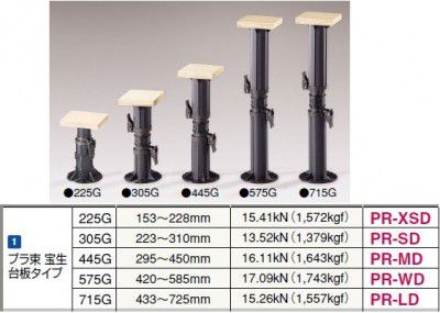 プラ束 宝生台板タイプ225G● 高さ調整範囲:153228mm● 最大荷重強度:15.41kN(1572kgf)● コ ー ド :PR-XSD● 調整後の固定がワンタッチの機構で施工性アップ。● ナットと連動するストッパー機構で調整後の固定が 素早くできます。● 素手で固定できるワンタッチ式ストッパーの採用。● 固定状況はレバーの状態を目視で確認するだけで 簡単に判断できます。● 支持脚の伸縮方向はボルト中央部に刻印表示して いますから、調整作業に戸惑いません。● 高さ限度制限機構により、適正な強度が確保できる 範囲内で施工できます。● ワイドな高さ調整範囲に対応します。● ボルトのネジ山が見えないスッキリした形状です。※ クレゾール及びレゾルシノールなどの薬品が付着 しないようにしてください。※ 一般の居室床と荷重条件の異なる仕様の場合は 「プラ束宝生」の本数を増やすなどの補強を行って下さい。※ 屋外では使用しないで下さい。