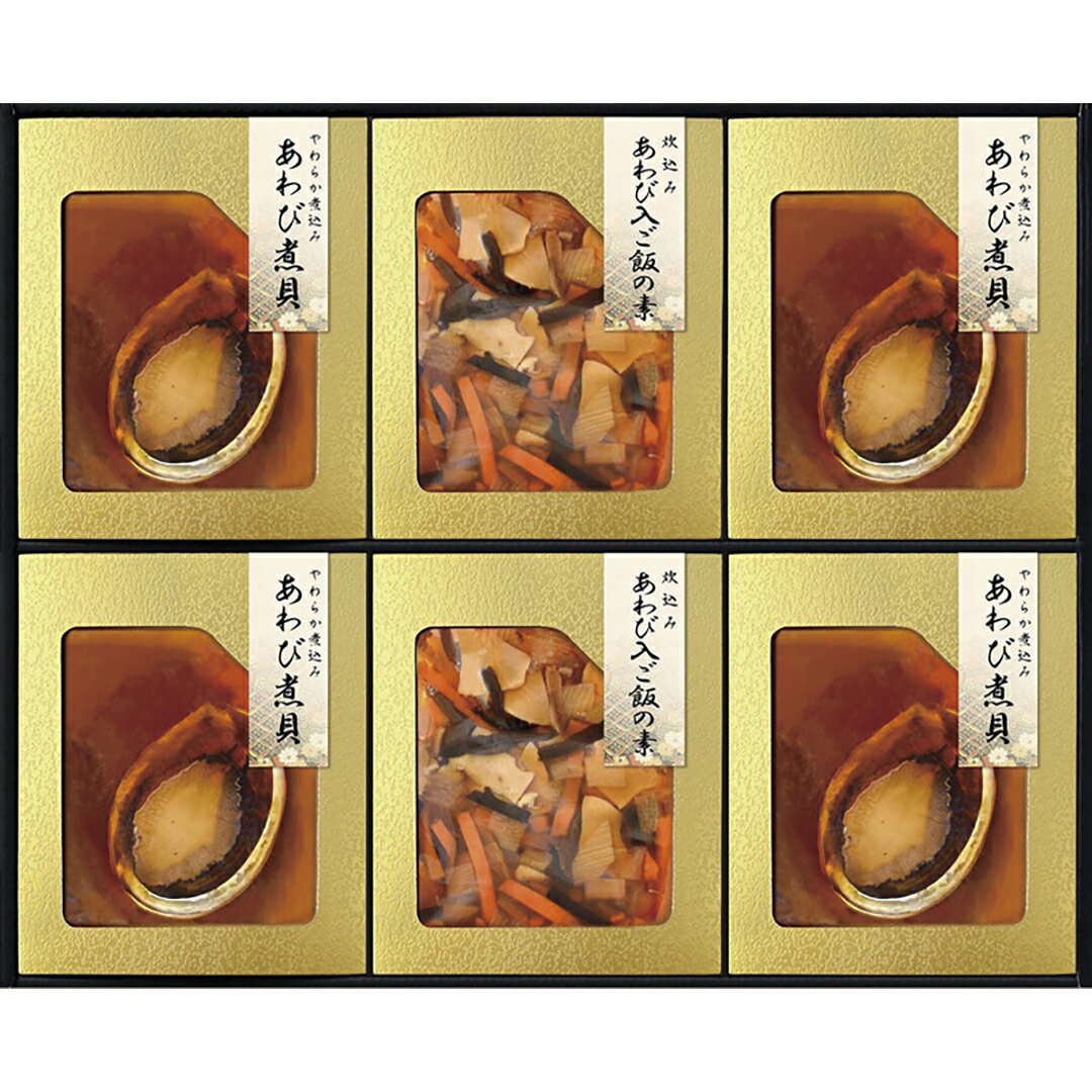 【商品詳細】あわびをじっくりと煮上げた「あわびの煮貝」は、ふっくらやわらかく仕上げ、あわびの豊潤な香りをお楽しみいただけます。といだお米と一緒に炊くあわびも入った炊き込みご飯の素とセットになった高級贈答品となっています。原材料:あわび姿煮:アカネアワビ(チリ産)、醤油(小麦・大豆を含む)、植物蛋白加水分解物、食塩、焼酎、発酵調味料、カツオエキス/トレハロース、調味料(アミノ酸等)、環状オリゴ糖、酸味料あわび仕込み炊き込みご飯の素:貝(カラコール:セネガル産、鮑:輸入)、人参、筍、還元水飴、醤油(小麦・大豆を含む)、椎茸、木耳、植物蛋白加水分解物、発酵調味料、食塩、カツオエキス/調味料(アミノ酸等)、酒精、酸味料、カラメル色素、香辛料抽出物アレルゲン:小麦・あわび・大豆商品区分:食品内容量:あわび姿煮40g×2個・あわび仕込み炊き込みご飯の素220g×1個製造国:日本賞味期限:製造日より常温約180日※別途パッケージ記載保存方法:常温【送料について】北海道、沖縄、離島は送料を頂きます。