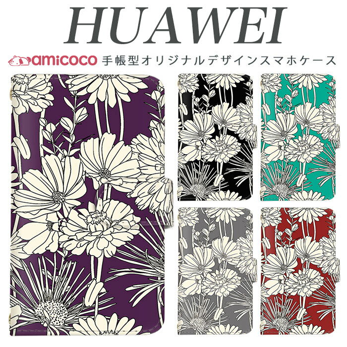HUAWEI 手帳型 スマホケース ファーウェイ ふぁーうぇい 花柄 線画 シンプル プレゼント 受注生産 VOG-L29 PAR-LX9 HUAWEI P20 Pro HUAWEI P30 lite HUAWEI nova lite 3 ANE-LX2J HUAWEI P20 lite LAY-L09 POT-LX2J HUAWEI Mate 9 MAR-LX2 YAL-L21 MHA-L29