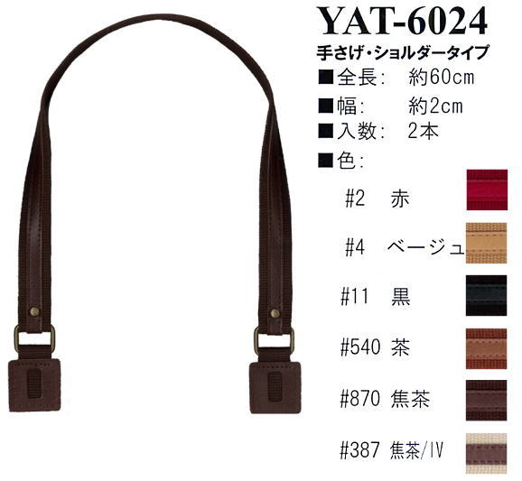 手さげ・ショルダータイプ■ 全長約60cm■ 幅2cm■ 入数2本■ 素材アクリルテープ×合成皮革■ 発送こちらの商品はお取り寄せ商品になります。 通常3?4営業日で発送いたします。***アクリルテープ×合成皮革持ち手*** 手さげタイプ YAT-4010 YAT-5010 YAT-402 YAT-482 YAT-4868 YAK-4014A YAM-4005 YAM-4532 YAT-4314 LM-4047 YAT-5022BN YAT-4101 YAT-424 手さげ持ち手 YAT-5120 手さげショルダータイプ YAT-6068 YAT-6024 YAT-6015 YAT-6522BN YAT-622 YAT-624 ショルダータイプ YAT-7615 リュックひもタイプ YAT-1031 ショルダーと肩当てのセット YKS-14103 YKS-14154