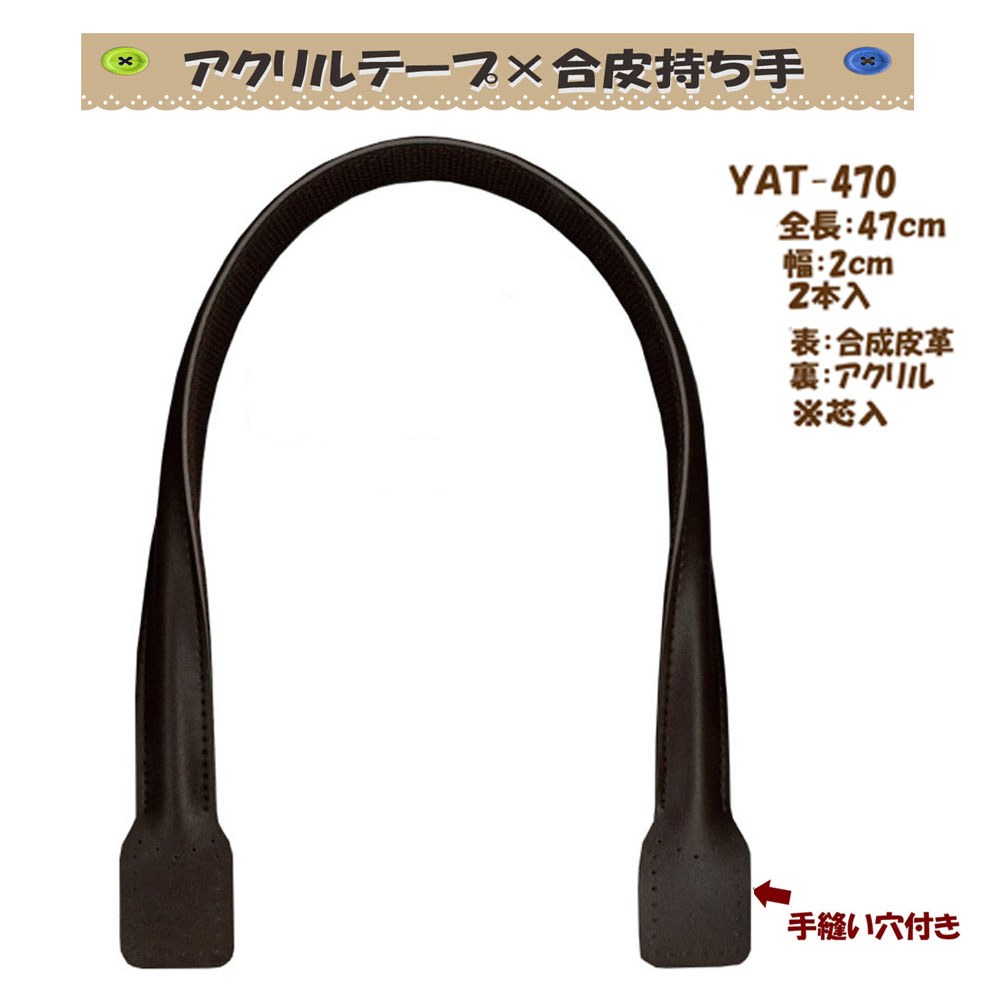 手さげタイプ■ 全長約50cm■ 太さ約1cm■ 幅約3.8cm■ 入数2本■ 素材アクリルテープ×合成皮革 ※ミシン縫い付け可■ 発送こちらの商品はお取り寄せ商品になります。 通常3?4営業日で発送いたします。***アクリルテープ×合成皮革持ち手*** 手さげタイプ YAT-4848 YAT-50 YAT-450 YAT-470 YAT-670 YAT-5038 YAT-4069 YAT-406 YAT-4049 PAT-146 YAT-4092 YAT-3822 手さげタイプ YAT-4014 YAT-4039 YAT-4064 手さげショルダータイプ YAT-606 YAT-6069 レザーオン持ち手 YAT-4336 携帯電話ケース用 YAT-2210 ふろしきバッグ持ち手 YAS-330