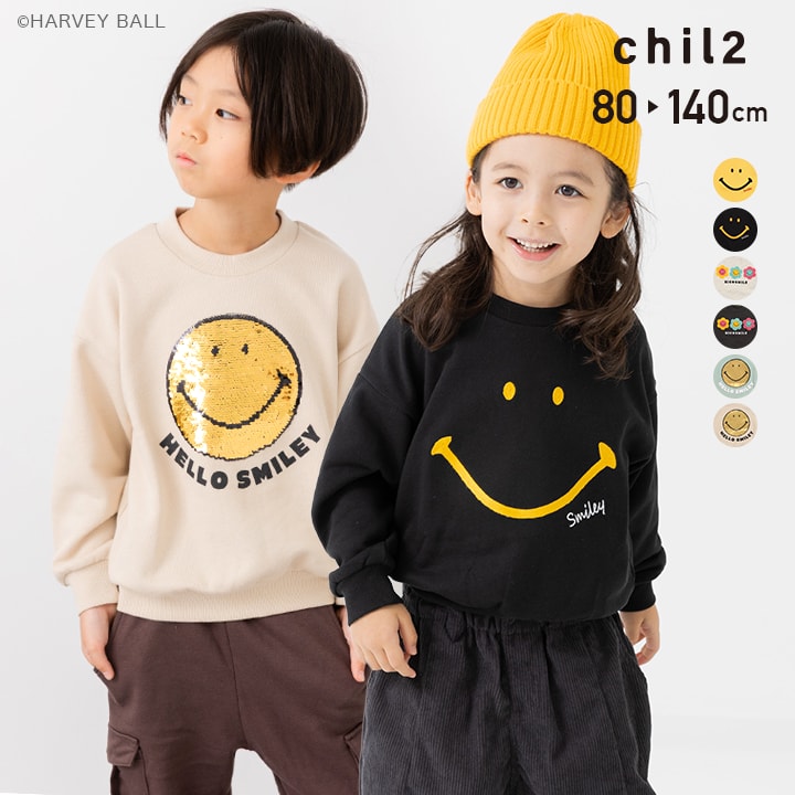 ゆうパケ送料無料 キッズ トレーナー ニコちゃん スウェット 子供服 ベビー服 裏毛 長袖 スマイリー 男の子 女の子 かわいい キャラクター トップス サガラ刺繍 スパンコール SMILEYFACE 秋冬服 80 90 100 110 120 130 140cm [M便 1/1]