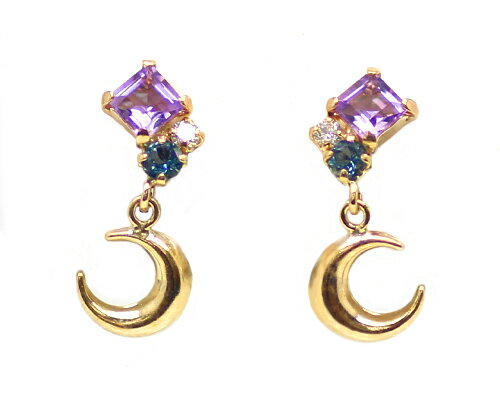 K10 YG/WG/PG アメジスト ロンドンブルートパーズ ダイヤ ムーン デザインピアス