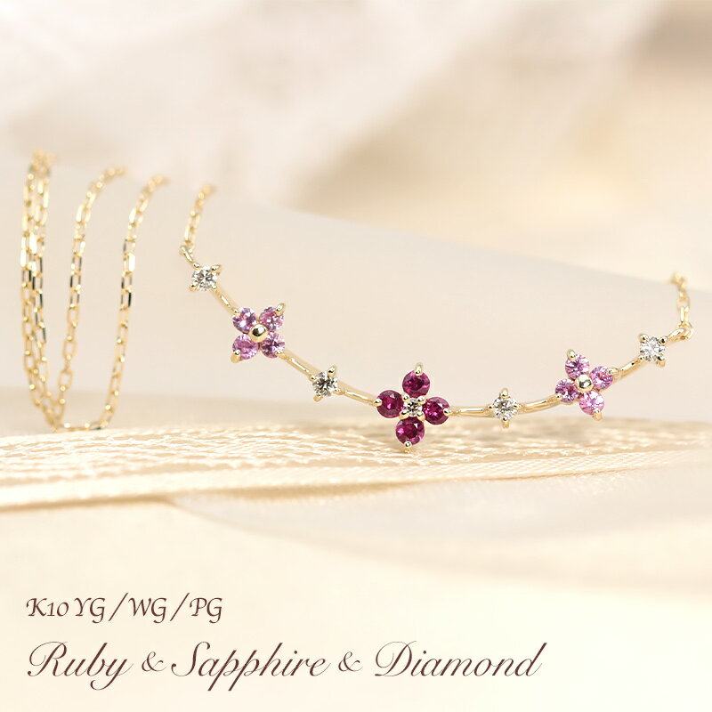 K10 ルビー 4p ピンクサファイア 8p ダイヤモンド 0.04ctUP 【Hカラークラス/SIクラス】 フラワー ライン ペンダント ネックレス ダイヤ 5p ゴールド 10金 ギフト 誕生石 可愛い 天然石 パワーストーン プレゼント 彼女用 妻用 クリスマス 母の日