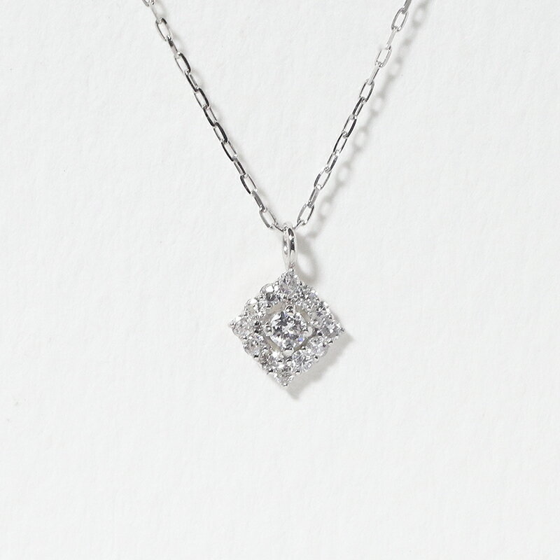 【送料無料】【品質保証書】 ★スクエアデザインの中心にダイヤが1石輝き、取り巻く12石のダイヤがさらに引き立てます。 胸元を華やかにしてくれる商品 これ1つ身につけているだけで女性らしく清楚に高級感を出してくれます。 ピアスで同じデザインもございます。 ☆☆クリスマスプレゼント、結婚記念日、ホワイトデーなどのアニバーサリーやメモリアルなどの贈り物に最適です。 ■商品詳細(写真1) 材質 K18YG/WG/PG(18金) 石 天然ダイヤモンド : ダイヤモンド0.08ct 計13石 最大幅 約縦6mm×幅6mm MEMO 選択肢よりお好きな金種をお選びください K18アズキチェーン:最大40cm / 3cm短く調整ができます。