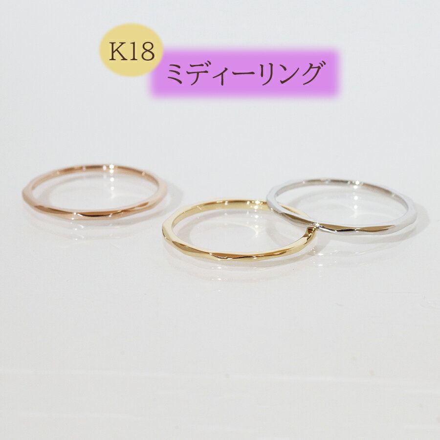 【送料無料】【品質保証書】 ☆シンプルなデザインのミディーリング。可愛さとシャープさを兼ね備えた一品。 なめらかなゴールドのフォルム。 重ね付けとしてももちろん、お手持ちのリングのサイズにお困りの方に、ストッパーリングとしてもオススメ♪ カジュアルからフォーマルまで、幅広い用途でお使いいただける嬉しいアイテム♪ レイヤードしても可愛い、毎日を輝かせてくれる、日常使いの本物ジュエリーです。 ■商品詳細(写真1) 材質 K18YG WG PG(イエローゴールド、ホワイトゴールド、ピンクゴールド) 幅 約1.1mm 付属品 品質保証書