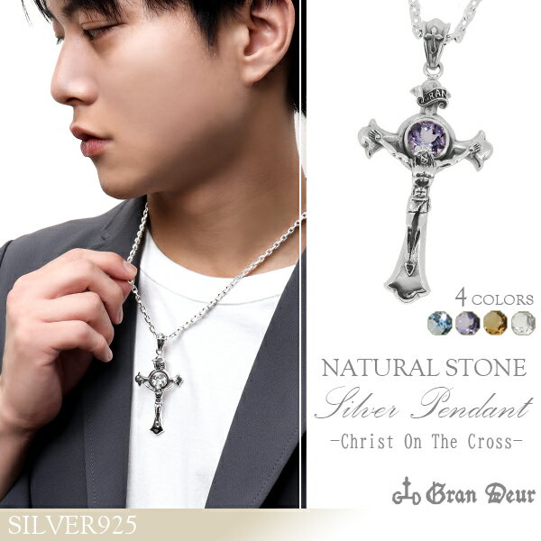 GRAN DEUR 十字架のキリスト 大粒4カラット天然石 シルバーネックレス チェーン付きペンダントトップ シトリン トパーズ アメジスト イエス クロス 4ct INRI シルバー925 銀 メンズ ネックレス 男性用 大型 ブランド クリスマス プレゼント 人気 彼氏 おしゃれ