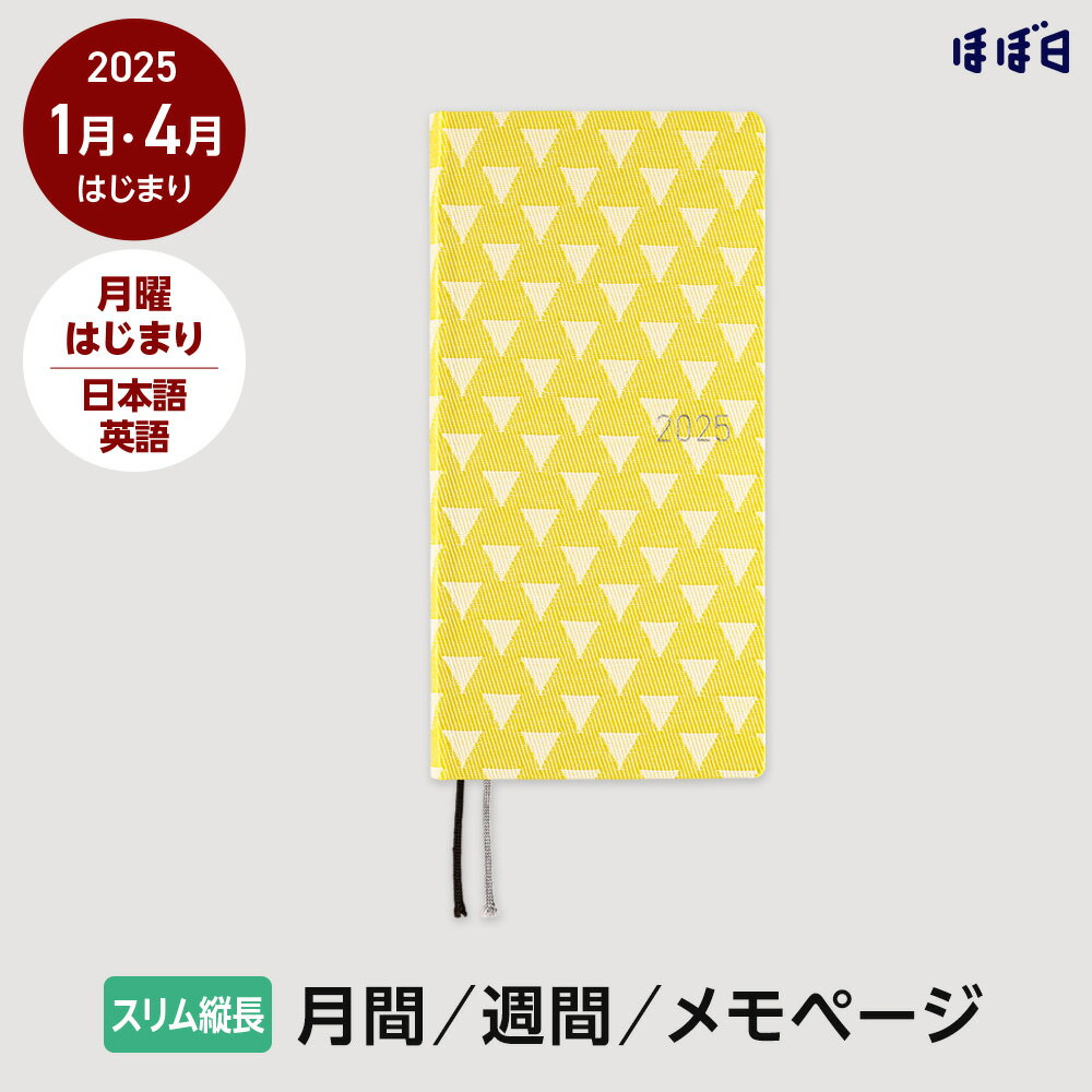 こちらは2025年はじまりの商品です。2026年はじまりの商品ではありません。 2025年はじまりの手帳はこちら 「使ったことないけど、ためしたい」かたはもちろん、 「使っているけど、家族や友人にもおすすめしたい」というかたに、 ぜひほぼ日手帳をおためしいただけたらと、 一部商品を約60%OFFの特別価格にて販売します。 つかってみてくださいね。 コンパクトなスリム縦長サイズで、 週単位の予定やTO DOの管理に。週間レフトタイプ weeks 携帯性を重視した、週間タイプのほぼ日手帳です。長財布と同等の大きさで、厚みは抑えたスリム縦長サイズ。鞄やスーツのポケットにもらくらく入ります。 基本ページは「週間予定+メモ」。左ページに1週間の予定、右ページにその週のメモを書くことができる「週間レフトタイプ」です。 ほぼ日手帳ならではの「日々の言葉」も、1週間に1つ掲載。コンパクトながらメモページが充実しているのも特長で、巻末には方眼ノートをたっぷり収録。 カバーをつけずに使えるタイプで、さまざまなデザインからお好みの表紙を選べます。 英語版(weeks・weeks MEGA) 日本語版のweeksを受け継いだデザイン。日付や曜日の表記はもちろん、「日々の言葉」や巻末のおまけページまですべてのページが英語で表記されています。 ※英語版のweeks・weeks MEGAは1月はじまりのみです。 yuge fabric farm / うろこ紋 [weeks/週間レフト/日本語版・英語版/1月 4月/月曜はじまり] 元来、金箔を貼った紙を細く切り、 その糸で模様を織り出して作られる「金襴」。 その技法を使った生地で シンプルな手帳カバーを作りました。 この生地を取り扱っているのは、 ENIMA DESIGNが立ち上げた 手芸屋「yuge fabric farm」。 ENIMA DESIGNはこの他に、 国内外から集められた古物、美術品、衣類を扱う お店「Essential Store」を運営しています。 「yuge fabric farm」は、眠ったままになっている 国内外の生地を発掘する 「生地レスキュー」という活動を行っていて、 それらを新たなものづくりの素材へと昇華しています。 このweeksの生地も、 広島の工場から発掘してきた貴重なものです。 うろこのようなこの柄は、 古来中国で好まれた文様です。 中国の古い伝説では、鯉が瀧を昇天して龍になると 伝えられており、最上級の文様として 大名家の家紋に使用されるなど、 名物柄として伝わっています。 上品な織りがひと目でわかり、 鮮やかな黄色が美しいデザインです。 表紙と背表紙に、それぞれシルバーの箔押しで 「2025」の数字を入れました。 光を受けてキラリと輝きます。 裏表紙には、「yuge fabric farm」の ロゴを入れました。 伝統ある素材で作られた、 特別なweeksといっしょに、 あなただけの歴史を紡いでください。 「ほぼ日手帳 weeks」には、裏面がシールになっていて好きな場所に貼れる「クリアポケット」がついてきます。 本体にはうすくて軽く、丈夫な手帳専用紙「トモエリバー」を使用しています。 2024年版でリニューアルしたこの用紙は、より裏抜けがしにくく、同じ厚みでもより軽く、紙の繊維を整えて表面をよりスッキリと改良させた新しい手帳専用紙になりました。 weeksの本体には予定や日記を書けるようなページのほか、たっぷり69ページ(英語版では73ページ)の方眼メモを収録しています。 巻末にはおまけページとして「まねして描けるスケジュールアイコン」「47都道府県のおすすめ麺リスト」が新たに追加となりました。 「ほぼ日手帳2025」のweeksには日本語版と英語版があります。 こちらの表紙デザインでも、お好きな言語をお選びいただけます。 ※英語版は1月はじまりのみとなります。 収納がほしいときや、雰囲気を変えたいときには、専用のweeksカバーをつけて、カスタマイズすることもできます。 商品ラインナップをみる ■万年筆などをご使用になる場合は試し書きをおすすめします ほぼ日手帳で使用している「トモエリバー(手帳用)」の紙は、裏うつりしにくいことが特長です。 ただし、万年筆や水性インクのペンをお使いの場合や、状況によってはにじみや裏うつりが出たり、乾きにくいことがあります。 あたらしいペンを使う場合は、あらかじめ目立たない場所で試し書きをすることをおすすめします。 ■柄の出かたはひとつひとつ異なります 柄の出かたはひとつひとつ異なります。実物と画像で柄の出かたが異なりますことをあらかじめご了承ください。 ■とがったものなどがひっかからないようご注意ください 生地の特性上、とがったものなどが引っかかりやすいためご注意ください。 ■年号の箔押しがはがれることがあります 表紙の年号の箔押しの文字は、日々お使いいただくうちにはがれることがあります。強くこすらないようご注意ください。 ■高温、多湿の場所を避けて保管してください 温度や湿度の高い場所に長時間置いておいたり、他のものと長時間密着させておくと、変質や色落ち、色移りが起こるおそれがあります。 類似商品はこちらほぼ日手帳2025 / weeks [スリム縦1,760円~