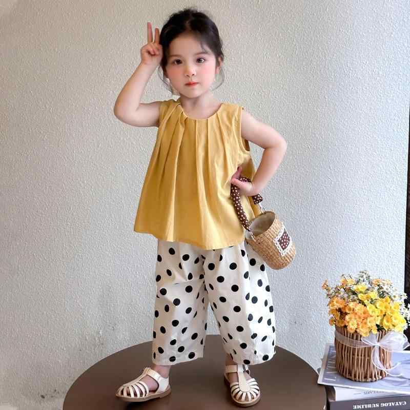 キッズ 女の子 ベビー ドット柄 水玉 セットアップ 夏 薄手 女児 ノースリーブ ベスト パンツセット おしゃれ かわいい 綿混紡 韓国風 普段使い 2点セット