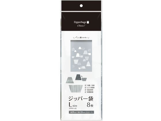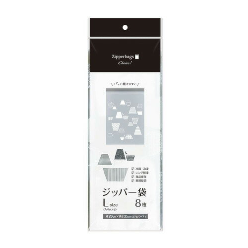 オルディ チョイス ジッパー袋 L06-8P グレー A4が入る デザイン柄入り CH-ZLD06-8発売日:2023年10月1日●A4サイズが入る大きさ食品保存や小物の収納などに使用できる“Choice!”ジッパー袋です。・Wジッパーでしっかり密閉。・上部ジッパーは閉めた感覚がわかりやすいクリック機能付。・リップの表面が透明なのでメモができて仕分けもしやすい。・リップに段差があるのでパッと開けやすい。・食品衛生法(厚生省告示第370号)に適合しているので安心して食品調理に利用可能。 【仕様】商品本体サイズ:幅260×奥行370×高さ1mm商品重量:9g材質:低密度ポリエチレン耐熱温度:-30度かわいいデザイン柄入り:06(グレー)ヤギ