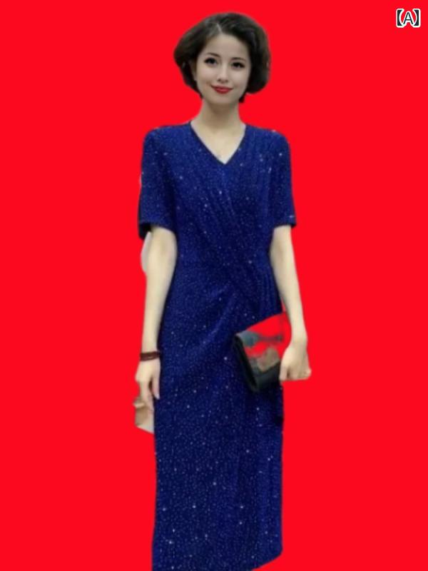 レディース ドレス ワンピース Vネックの 明るい ラインストーン プリーツの 高級 スリム ドレスの 西洋風の レディース 夏の高 弾性の レジャー ロング スカートの 母親の 服
