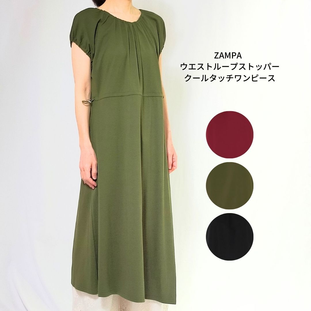ザンパ ZAMPA ウエストループストッパークールタッチワンピース|袖口ゴム|フレンチスリーブ|アシンメトリー| ワイン・カーキ・ブラック【送料無料】