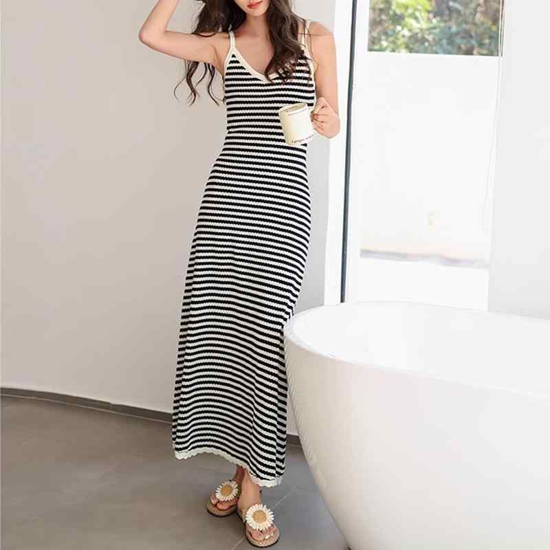 ・图案: 其他・工艺: 其他・款式: 吊带款・组合形式: 单件・裙长: 长裙・裙型: A字裙・领型: V字领・袖型: 无袖・袖长: 无袖・腰型: 高腰・流行元素: 收腰・主な素材: 聚酯纤维・主な素材2: 聚酯纤维・カラー: 条纹连衣裙・サイズ: S, M, L・スタイル: 御姐风・裙类别: 连衣裙・跨境スタイルタイプ: 气质优雅・门襟: 套头・主な素材2含有量: 30%以下