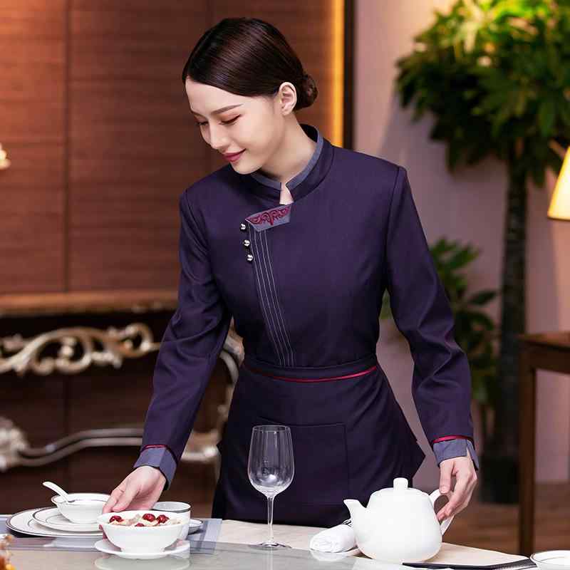 制服 レディース ホテル レストラン 飲食店 接客業 サービススタッフ ユニフォーム 吸湿速乾 綿 ポリエステル 混紡 長袖 トップス 上着 レッド パープル ブルー 春秋冬