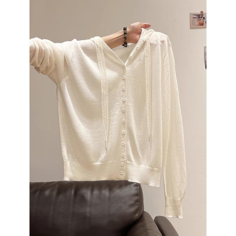 カーディガン レディース 薄手 ニット シアー感 フード付き ポリエステル 長袖 トップス 無地 冷房対策 日焼け防止 白色 青色 黄色