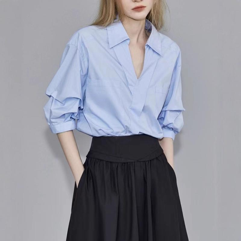 シャツ レディース 長袖 Vネック 白色 ブルー ポリエステル 綿 混紡 ゆったり 薄手 5分袖 トップス 通勤 きれいめ おしゃれ