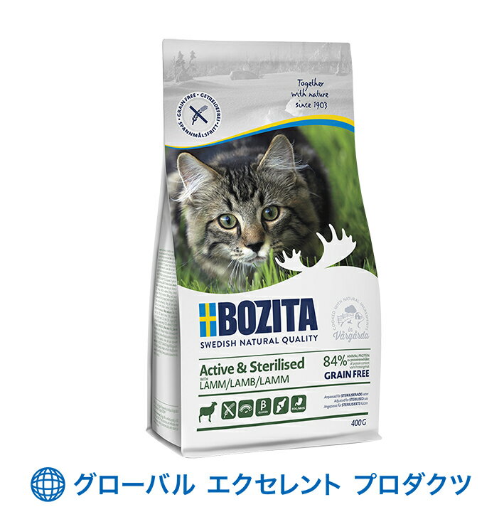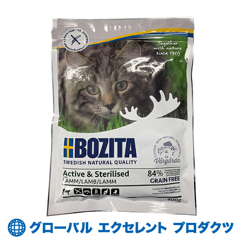 【正規輸入品】猫用 ナチュラル アクティブ&ステリライズド グレインフリー ラム 400g ボジータ キャットフード 低ヨウ素(総含有量0.5mg/kg) 活動レベルの高い成猫の完全栄養食 賞味期限:2026.01.03