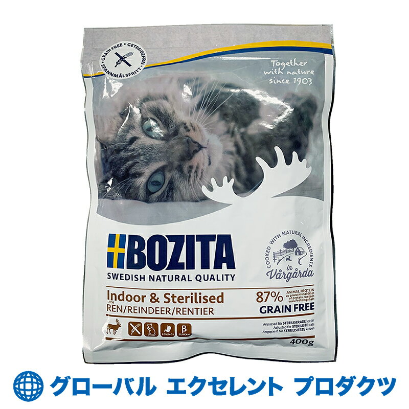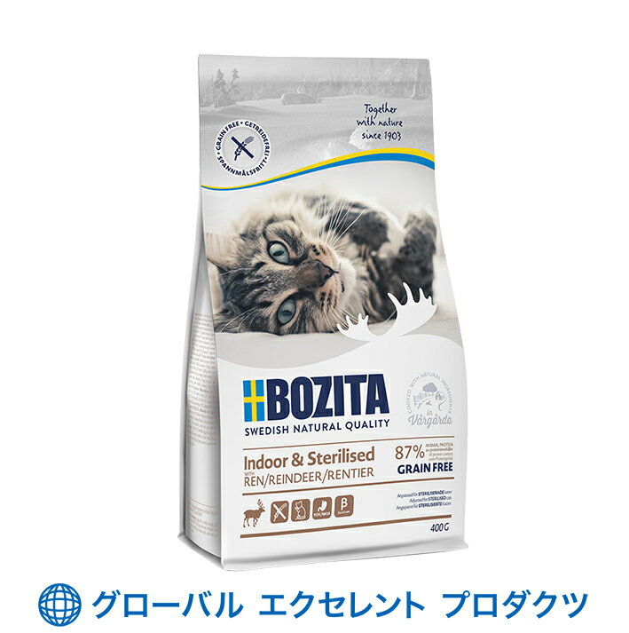 【正規輸入品】猫用 ナチュラル インドア&ステリライズド グレインフリー トナカイ 400g ボジータ キャットフード ドライフード 低ヨウ素(総含有量0.5mg/kg) 屋内飼育や去勢した猫、高齢猫や体重過多の猫の完全栄養食 賞味期限:2026.01.12