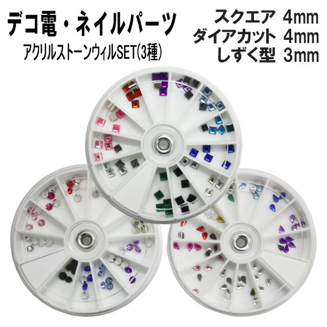 【収納ケース付きラインストーンセット】スクエアorダイアカットorしずく型 アクリルストーン ストーンウィル ラウンドケース 収納ケース ストーンケース スライド式 回転式 仕切り12個 円 丸 ラウンド ランダム カラフル キット ネイル ジェル デコ【あす楽】【パーツ】