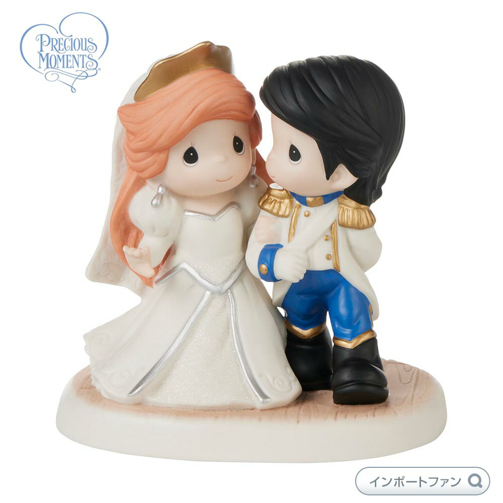 アリエル エリック王子 そして彼らは幸せに暮らした リトル・マーメイド ディズニー は、日本未発売のかわいらしいビスクドール作品です。アリエルとエリック王子は、永遠の幸せに向かって通路を歩きながら、満面の笑みを浮かべています。結婚式の衣装を着たカップルの愛が、多くのことを乗り越えることができることを表現しています。思いやりのある誕生日プレゼント、結婚祝い、またはアリエルの物語を愛する人への「ただの理由」のプレゼントとして贈ってください。■サイズ:高さ約13.9cm表情や仕草もとってもキュートです。細部にまでこだわりを感じるディティールです。コレクションはもちろん、誕生日のお祝い、お友達や大切な方へののプレゼントギフトとしてもオススメの作品です。 ビスクドールとは、陶磁器の人形で、釉薬が表面にかかっていない素焼きのもののことをいいます。表面に光沢がなく、光の反射が柔らかいので、高級感があります。一つ一つ職人の手によって仕上げられたプレシャスモーメンツのビスクドールは、優しい雰囲気と淡い色使いが日本のインテリアにも良く似合います。 ■Precious Moments(プレシャスモーメンツ) プレシャスモーメンツは、1970年代にアメリカのアーティストクリエイターのサム・ブッチャーが家族や友人への贈り物のカードとして描いたのが始まりです。優しい水彩画タッチで描かれたアートコレクションは、幅広い女性層から人気を集めています。ディズニーとも深い関係があり、WDWコンベンションでも出品されるなど、ディズニーのキャラクターをモチーフにしたコラボレーション作品も多数発表されています。 ■お届けについて 日本では発売されていないレアなアイテムをできるだけたくさん皆様の元へお届けするため、ご注文からお届けまでに3週間前後かかります。 通関等により、予定よりもお時間がかかる場合がございます。当店に到着次第すぐに発送させていただきます。 ■ご注意 こちらは、お客様ごとのオーダー受注のため、受注確認後の変更、キャンセルはできませんのであらかじめご了承の上、ご購入くださいませ。 インポートファンでは、細心の注意を払い現物に近い状態で掲載しておりますが、お使いのモニターやブラウザ等の環境によって実物の色合いが画像と若干異なる場合がございます。また、プレシャスモーメントは、一つ一つ職人の手によって彩色されていますので、色むらや同じシリーズであってもひとつひとつ違った表情をしております。黒い点・ごく小さなくぼみ・ざらつきなどが見られたり、空気穴部分の破片等が商品内に落ち、内部でカラカラ音がするものもございます。これらは商品制作工程上やむを得ない現象となります。日本の税関で開封検査を受けますので、箱には必ず開封した跡やテープ痕があります。また、発表されてから年数の経った作品や絶盤作品等は箱などが経年変化によりヤケや汚れがあることもございます。インポートファンでは、全て新品・未使用のものを扱っておりますので、ご安心くださいませ。 インポートファンでは、他店舗でも販売しておりますため、在庫の個数がございましても、完売もしくはおとりよせとなる場合がございます。 ■プレシャスモーメントのお手入れ方法 こちらは装飾品であり、玩具ではありません。12歳以下のお子様によるご利用は対象としておりません。磁器ですので、安定したスペースに展示してください。 普段のお手入れは、セーム革や羽根ばたき、等で埃や指紋をやさしく取り除いてください。長期間展示して、汚れがひどい場合は、水またはぬるま湯に中性洗剤を薄めて手早く洗い、よくすすいでから自然乾燥させてください。また、熱湯は絶対避けてください。