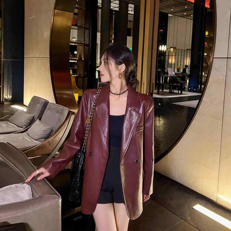 秋冬 コーデ レディース ファッション オシャレ 服 カワイイ シンプル 大人カワイイ 大きいサイズ アンゴラ レッド フライド ストリート レトロ PU レザー スーツ レザー ジャケット トップス