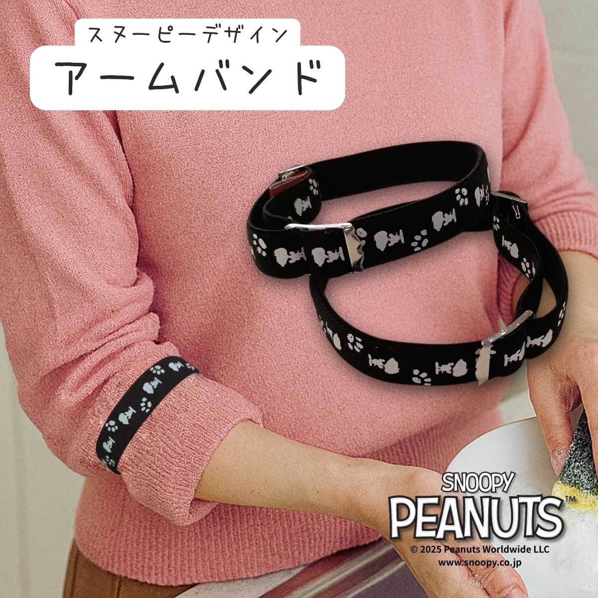 SNOOPY スヌーピー アームバンド 日本製 2個セット | 袖留め 袖どめ アームベルト 腕バンド 袖まくり メンズ レディース 女性 クリップ Yシャツ ブラウス スーツ かわいい 家事 ゴム製 PEANUTS ピーナッツ サイズ調整可能 フォーマル ビジネス カジュアル 腕まくり