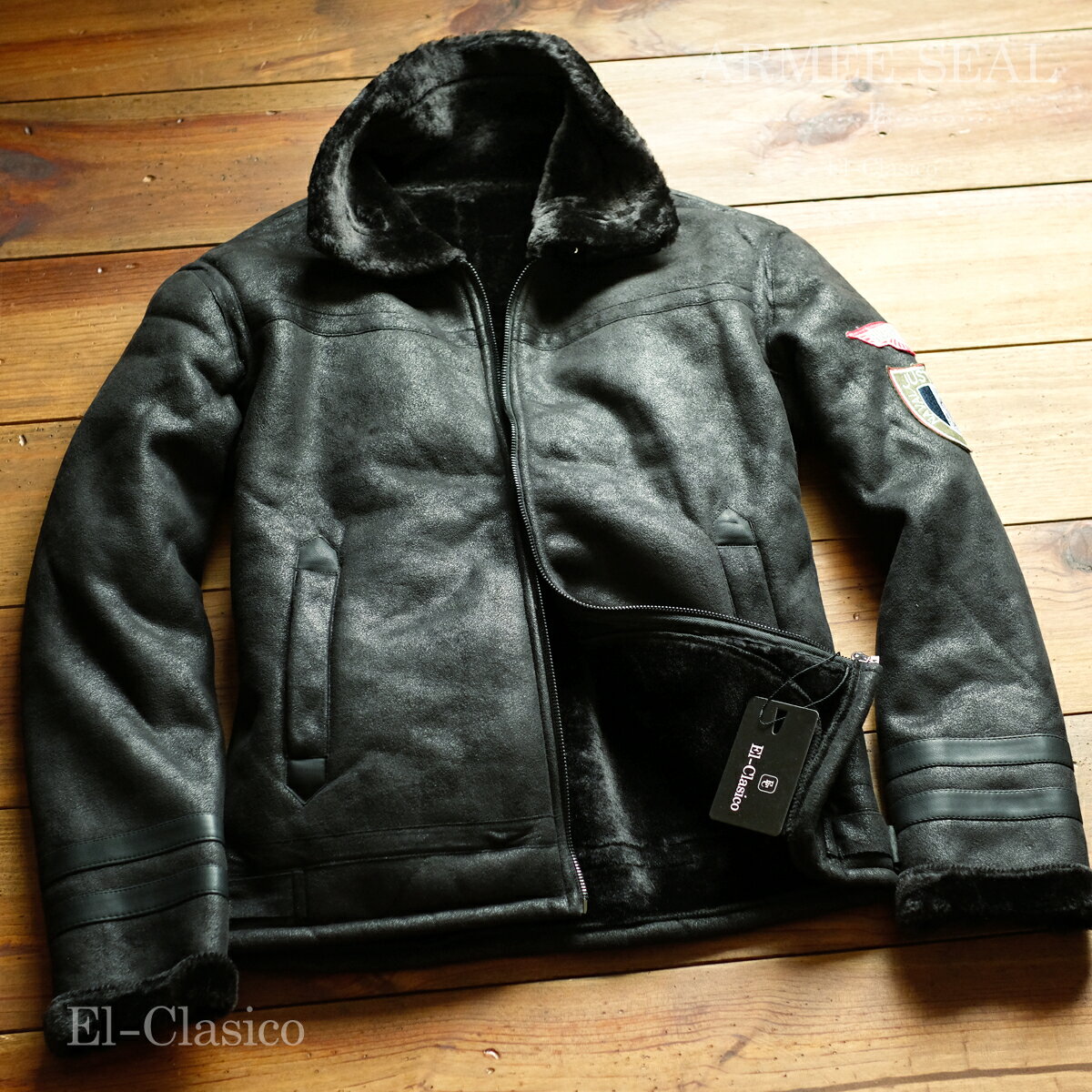 新品*フランス*ARMEE SEAL* B-3 ボア フライト ムートンジャケット ブラック 黒■仏空軍 襟 腰ベルト 秋冬 メンズ アウター◆SEAL-BK B-3本格派フライトジャケット 海外はフランスから「ARMEE SEAL」の素敵なフェイクムートン、B-3本格派フライトジャケットの出品です。当店エル・クラシコのお奨めの超選りすぐりジャケットです。フランスエンブレムが素敵でムートンの質感がかっこいい☆裏地のボアはびっしり袖までふかふかでこの冬活躍間違いなし。状態:新品カラー:ブラックサイズ:M・L・XL・XXL・XXXL・4XL実寸:(平置き実寸)M:着丈約64cm 胸囲約106cm 肩幅約45cm 袖丈約61cmL:着丈約66cm 胸囲約110cm 肩幅約47cm 袖丈約62cmXL:着丈約68cm 胸囲約114cm 肩幅約48cm 袖丈約63cmXXL:着丈約70cm 胸囲約118cm 肩幅約49cm 袖丈約64cmXXXL:着丈約72cm 胸囲約122cm 肩幅約50cm 袖丈約64cm4XL:着丈約73cm 胸囲約124cm 肩幅約51cm 袖丈約64cm素材:SHELL・LINING/POLYESTER100% 5