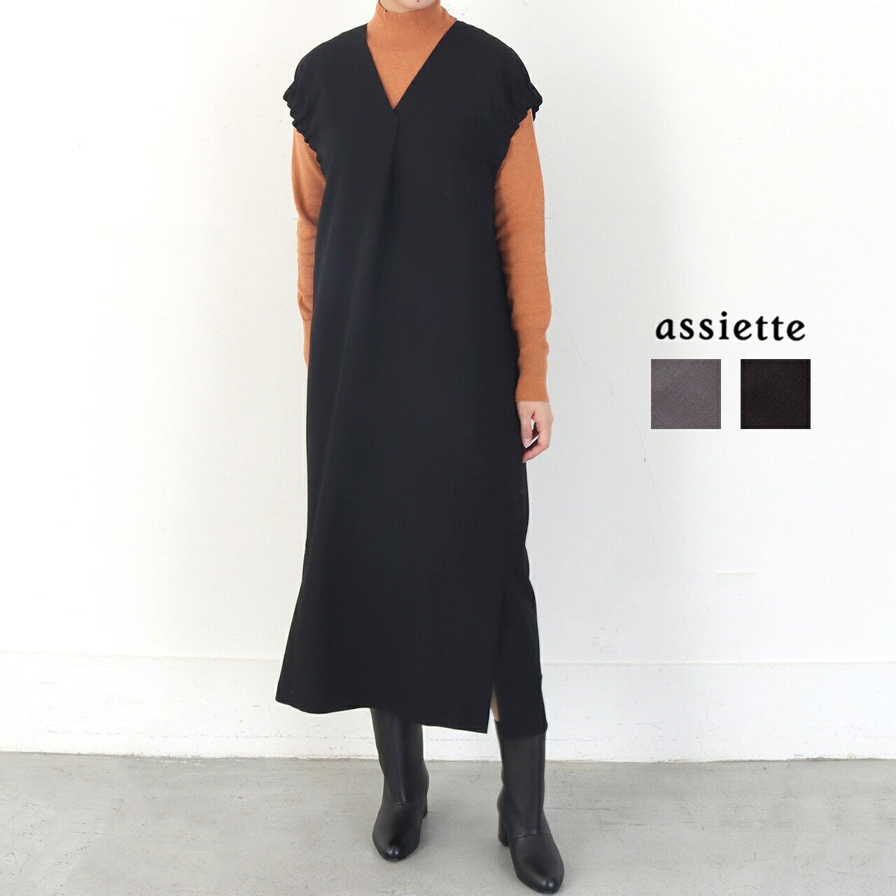 【最終日11%OFF 良い(11)服クーポン】【20%OFF アウトレット】assiette アシェット Vネック 袖口ギャザーワンピース セレモニー お出かけ オフィス ロングワンピース レイヤード オケージョン ウォッシャブル 軽い シワ防止 FS
