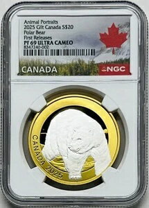 2025年 20ドル カナダ 1オンス 銀メッキ NGC PF69 動物肖像 ホッキョクグマ トップ ポップ-8 FR