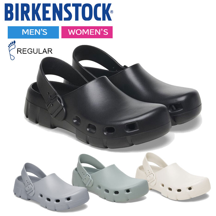 BIRKENSTOCKのBirki Flowは季節を問わず一年中便利な真の定番です。大きな通気孔が空いているこのクロッグなら、いつも新鮮な空気が循環し、足がムレる心配もありません。コルク製サンダルの形状を模しながら、このサンダルには柔軟性に優れた超軽量素材EVAを使用しています。有害物質検査済みのEVAは無臭など様々な特性が自慢の素材です。お洒落で軽やか、弾性にも富んだこのモデルは、ショックをしっかりと吸収し、防水性にも優れ、お肌にも優しい一足です。 足の形状を考慮したEVA製BIRKENSTOCKフットベッド アッパー/インソール/アウターソール: EVA 詳細:耐水性、ウォッシャブル、超軽量 “Made in Germany”42/27cm : 【重さ】188g / 【ヒール寸】2cm / 【プラットフォーム高さ】2cm