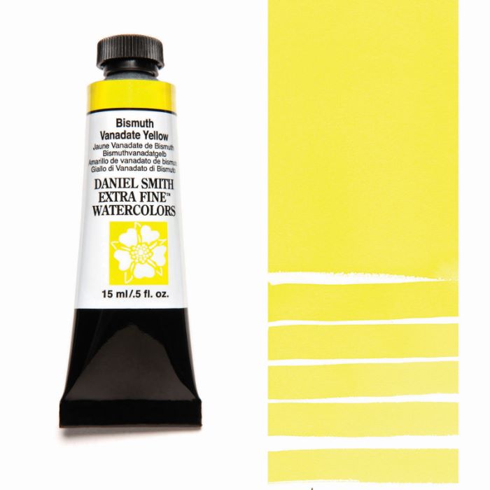 Bismuth Vanadate Yellow 15ml Tube - DANIEL SMITH Extra Fine Watercolor SKU: 284600154 Pigment: PY 184 | Series: 2 Lightfastness: I - Excellent Transparency: Opaque Staining: 2-Low Staining Granulation: Non-Granulating This opaque yellow, leaning slight towards green, appears opaque in mass tone, yet lifts cleanly. It is low staining, making it excellent in portrait mixtures for dark flesh tones. Use concentrated to diluted mixtures in florals and field flowers. Its lemon yellow hue works well with purples and all the greens.
