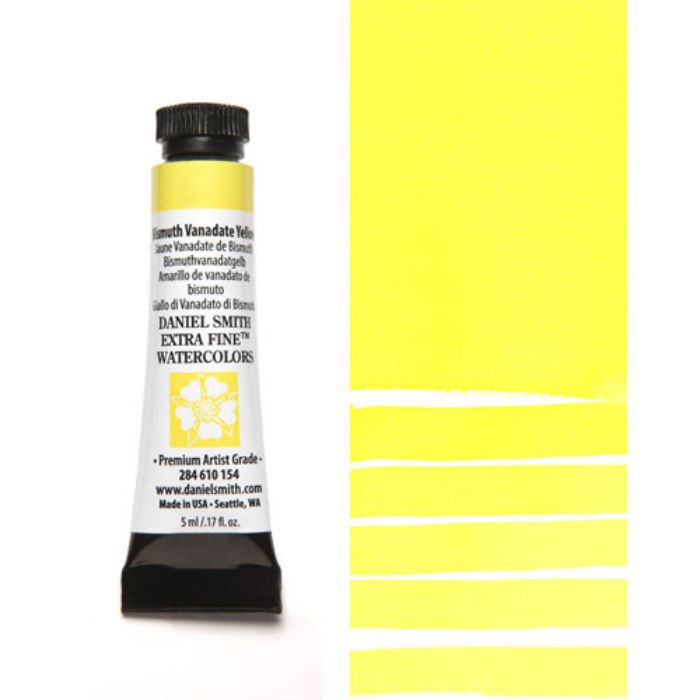 Bismuth Vanadate Yellow 5ml Tube - DANIEL SMITH Extra Fine Watercolor SKU: 284610154 Pigment: PY 184 | Series: 2 Lightfastness: I - Excellent Transparency: Opaque Staining: 2-Low Staining Granulation: Non-Granulating This opaque yellow, leaning slight towards green, appears opaque in mass tone, yet lifts cleanly. It is low staining, making it excellent in portrait mixtures for dark flesh tones. Use concentrated to diluted mixtures in florals and field flowers. Its lemon yellow hue works well with purples and all the greens.