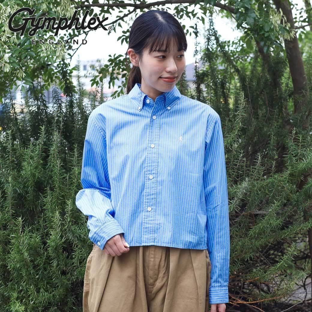 Gymphlex ジムフレックス コットン ポプリン ショート ボタン ダウン シャツ レディース 通年 コットン BLUE×WHITE STRIPE 14サイズ 長袖 ストライプ ショート丈 gy-b0203hps 送料無料
