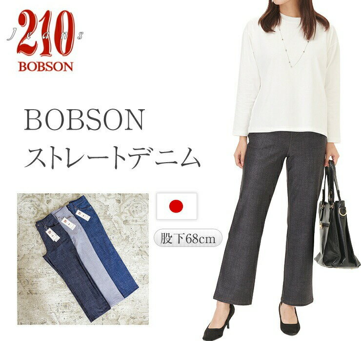 BOBSON 210 ストレート デニム パンツ レディース ボブソン 新品 日本製 ジーンズ ジーパン ウエストゴム ストレッチ 細見せ ロング丈 細く見える 動きやすい 大きいサイズ もあり ゆったり 脚長 着痩せ インディゴ ブラック グレー 4ポケット ポリエステル88% 股下68cm