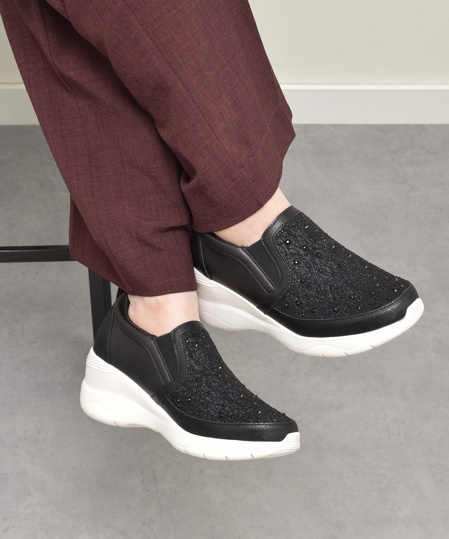 Bridget Birkin(ブリジットバーキン)【Round About】スリッポンヒールスニーカー【RoundAbout/ラウンドアバウト】ラインストーンがちりばめられたレース生地が女性らしい7cm高のヒールアップスニーカー。つま先が約2.5cmの厚底なので見た目ほど高さを感じず、ヒールが苦手な方でも履きやすいデザイン。クッション性のよいカップインソールが歩行時の衝撃を軽減してくれます。スリッポンデザインは脱ぎ履きがしやすく、デイリーにもご旅行にもおすすめです。足幅:3E(ゆったり)※生産過程に生じるキズが多少ある場合がございます。また素材の特性上、若干の色ムラ、擦れが見られる場合がございますが、こちらは素材の特性となります。予めご了承下さい。※輸送中に多少箱が破損する場合がございます。※サイズ換算(表記)はあくまで目安となります。型番:445104-015-225 NA8963【採寸】サイズcm(目安)ヒール(mm)22.522.57023.023.07023.523.57024.024.07024.524.570商品のサイズについて【商品詳細】中国素材:甲材:合成繊維/合成皮革、底材:合成素材サイズ:22.5、23、23.5、24、24.5※画面上と実物では多少色具合が異なって見える場合もございます。ご了承ください。商品のカラーについて 【予約商品について】 ※「先行予約販売中」「予約販売中」をご注文の際は予約商品についてをご確認ください。■重要なお知らせ※ 当店では、ギフト配送サービス及びラッピングサービスを行っておりません。ラッピング・ギフト配送について同時に複数の商品を注文された場合メーカー希望小売価格についてご利用ガイドBridget Birkin(ブリジットバーキン)【Round About】スリッポンヒールスニーカー【RoundAbout/ラウンドアバウト】ラインストーンがちりばめられたレース生地が女性らしい7cm高のヒールアップスニーカー。つま先が約2.5cmの厚底なので見た目ほど高さを感じず、ヒールが苦手な方でも履きやすいデザイン。クッション性のよいカップインソールが歩行時の衝撃を軽減してくれます。スリッポンデザインは脱ぎ履きがしやすく、デイリーにもご旅行にもおすすめです。足幅:3E(ゆったり)※生産過程に生じるキズが多少ある場合がございます。また素材の特性上、若干の色ムラ、擦れが見られる場合がございますが、こちらは素材の特性となります。予めご了承下さい。※輸送中に多少箱が破損する場合がございます。※サイズ換算(表記)はあくまで目安となります。型番:445104-015-225 NA8963【採寸】サイズcm(目安)ヒール(mm)22.522.57023.023.07023.523.57024.024.07024.524.570商品のサイズについて【商品詳細】中国素材:甲材:合成繊維/合成皮革、底材:合成素材サイズ:22.5、23、23.5、24、24.5※画面上と実物では多少色具合が異なって見える場合もございます。ご了承ください。商品のカラーについて