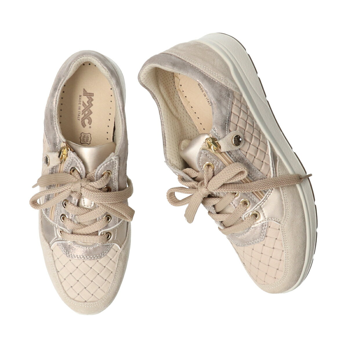 ■アウトレット商品■こちらの商品はアウトレット商品のため、靴箱に破損、汚れ、色やけ等が生じる場合がございますので、予めご了承ください。[型番:E35802]イントレチャート風の素材が涼しげなスニーカー。使い勝手のいいカラーでデイリーに活躍する一足。着脱し易いファスナー仕様です。1975 年にデビッド&レナート・マッツォッコーニ兄弟によって IMAC Spa (イマック)が設立されました。80 年代初頭より、伝統的に北欧の国々で評価され、市場開拓のために 力を注いできた、ポリウレタン製ソールの直接注入技術による製造で、足の快適さと健康を考えた高品質の商品を生産し続けています。※靴裏に保護シールが貼ってある場合がございます。ご着用の際は剥がしてご使用ください。また、検品の際に保護シールを一部剥がす場合がございます。天然素材を使用している商品の場合、特有のにおいが生じる可能性がございますが、不良ではございません。気になる場合は風通しの良い場所に置いていただくと軽減されるかと思いますのでお試しください。生産過程に生じるキズが多少ある場合がございます。また素材の特性上、若干の色ムラ、擦れが見られる場合がございますが、こちらは素材の特性となります。皮革を使用している商品の場合、表面はキズが付きやすい為、お取り扱いには十分にご注意ください。汗や雨などで濡れた場合、色移りする場合がございます。また革の品質保持のため、なるべく濡らさないようご注意下さい。インポート商品の為、輸送の際に多少箱が破損している場合がございますが商品に影響はございません。撮影時の光の当たり具合により色味が違って見える場合がございます 。また、お客様のお使いのPCモニターやスマートフォン画面などの環境により色味が実際の商品と違って見える場合がございます。サイズ換算(表記)はあくまで目安となります。足の形による適正サイズの個人差がございます。予めご了承ください。重さ:約273g■カラー:ベージュコンビ、ブラックコンビ※( )で表記されている数字はヌードサイズです。ヌードサイズとは衣服を身につけない身体のサイズです。お客様ご自身の身体サイズと比較してお選びください。 ■素材: 甲材:牛革 底材:合成樹脂 ■お手入: >>商品のお取り扱い方法 ■原産国: イタリアIMAC◆3.5cmヒール◆サイドジップイントレチャート風スニーカー/ブリジットバーキンセレクト(Bridget Birkin Select)ベージュコンビブラックコンビ画面上と実物では、多少色具合が異なって見える場合がございます。