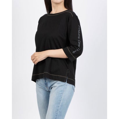 ◇身長167cm B83 W59 H85/モデル着用サイズL袖の筆記体ロゴが目を引くブラックTシャツです。ステッチ風の縁取りとサイドスリットがアクセントとなりモードな印象に。5分袖デザインで体型カバーも叶い、カジュアルにもキレイめにも対応します。こちらはアウトレット品です。主にはシーズン落ちの新品になりますが、中には細かな傷やシワ、若干の色落ち等がある場合がございます(訳あり品を除く)。40/L : 【着丈】57.5cm / 【肩幅】41cm / 【胸囲】96cm / 【袖丈】38cm別カラーはこちら! グリーン ブルー ベージュ